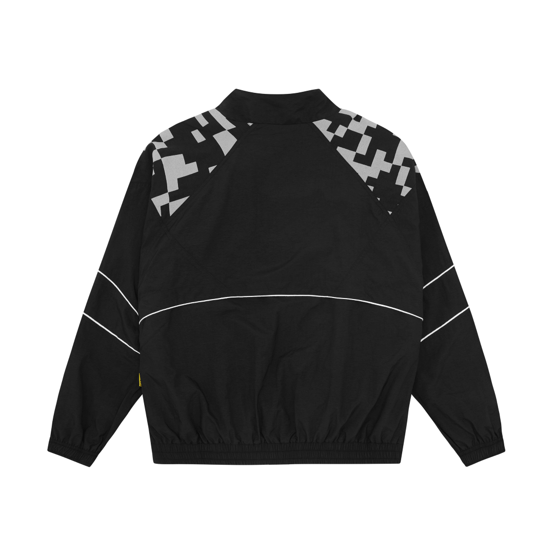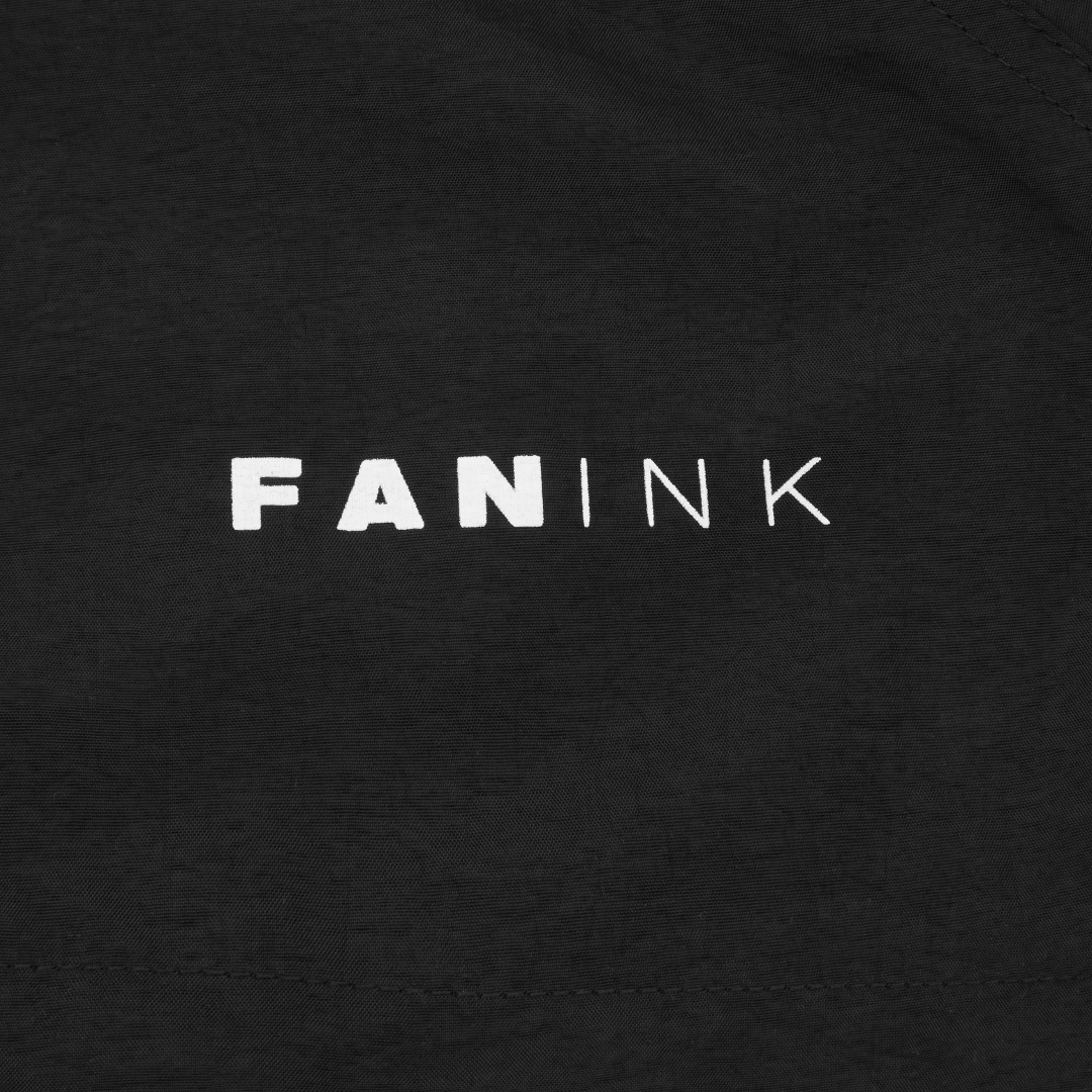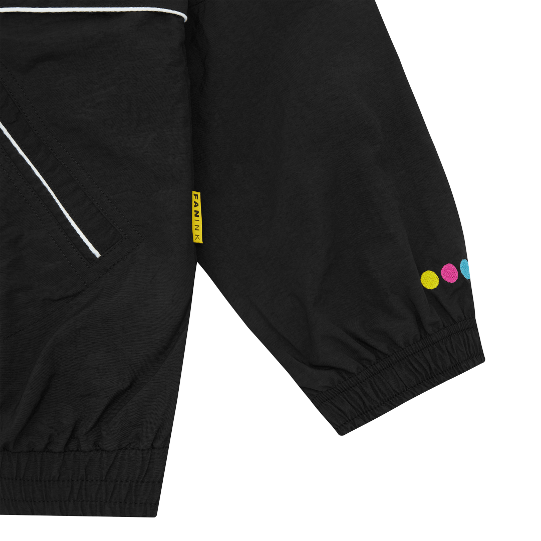 Digital camo print on shoulders. Contrast piping along sleeves, body, and pockets. Elasticized cuffs. Dual waist pockets. One-way zipper. Fan Ink screen printed at left chest. Fan Ink colours embroidered at left sleeve. Fan Ink woven label at side. Made in Portugal.